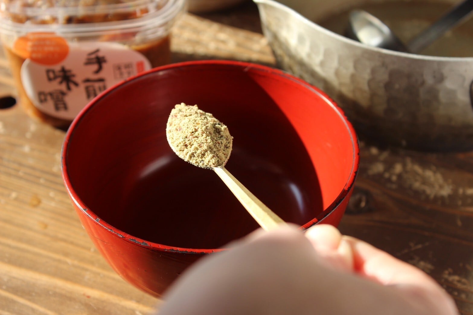 ◎一杯分のお味噌汁の場合:お椀に本品小さじ1/2程度と味噌小さじ1を入れて、熱湯200ccを注いでよくかき混ぜる。